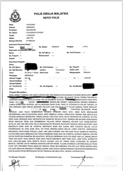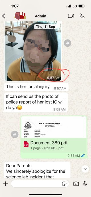 这名母亲向星洲网指出,意外于9月11日上午约9时在科学课堂上发生,惟校方并未立即通知家长,而是直到约10时才通过WhatsApp联系她。