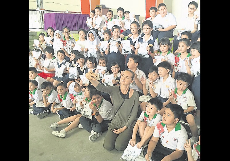 (柔佛.麻坡18日讯)麻坡“姐妹情深”人像壁画引风潮,俄罗斯画家茱莉亚今日走入校园,代表热心商家将80件印有壁画图像的衣服,致送予麻坡中化三小的学生,让学生们欣喜不已。