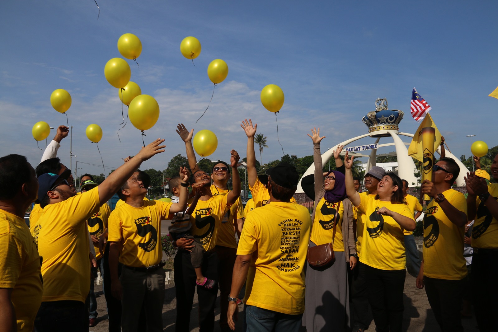 众人松开手中的气球为居銮前往峇株巴辖的净选盟5.0造势活动掀开序幕。 (图:星洲日报)