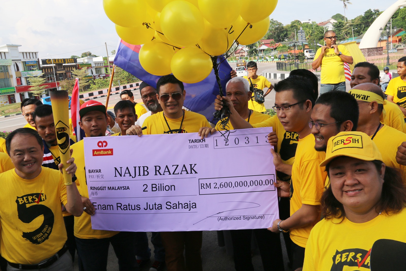 净选盟5.0支持者展示26亿令吉模拟支票;左为范平东,右一为周碧珠、右三为陈泓宾。 (图:星洲日报)