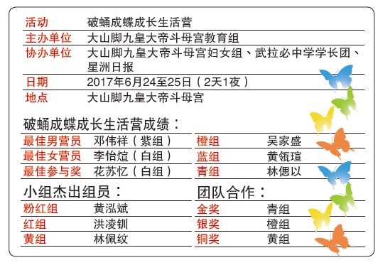 由大山脚九皇大帝斗母宫教育组主办,斗母宫妇女组、武拉必中学学长团及星洲日报协办的破蛹成蝶成长生活营,前晚圆满结束。