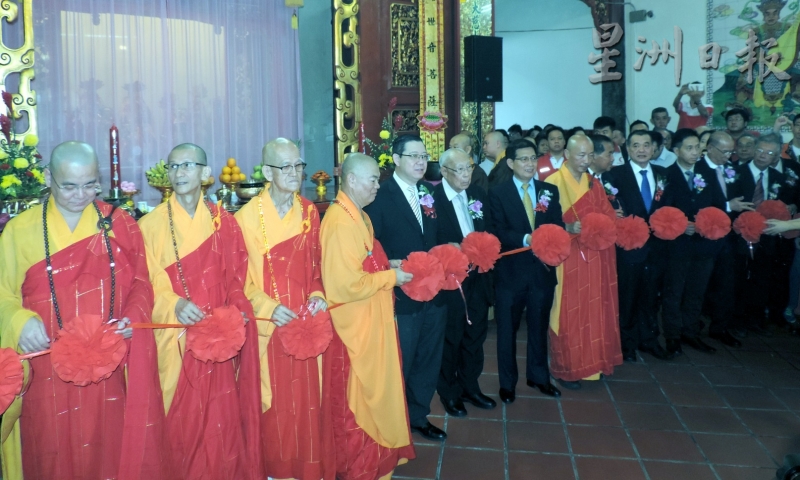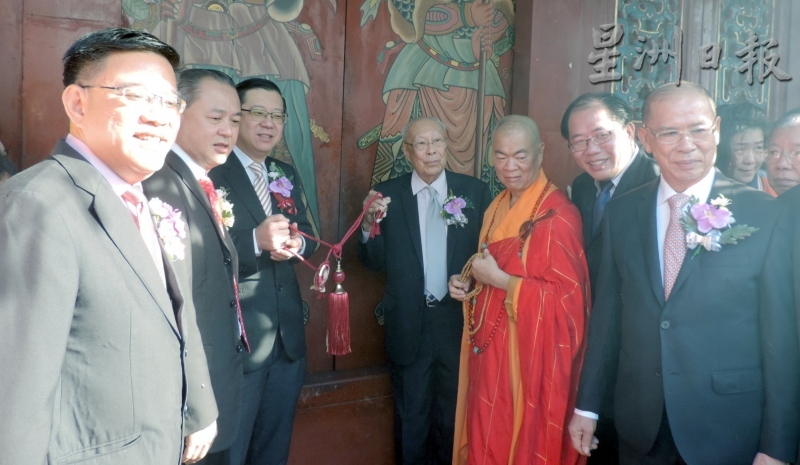 观音亭修建圆成举行剪彩仪式,左四起日恒长老、林冠英、邱吉寿、黄得轩及贤观法师。(图:星洲日报)