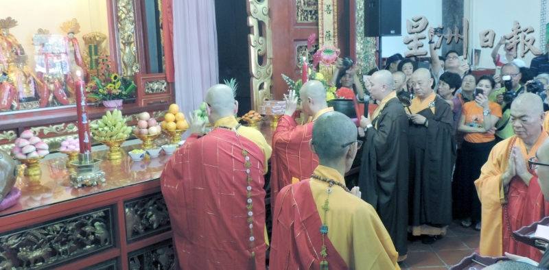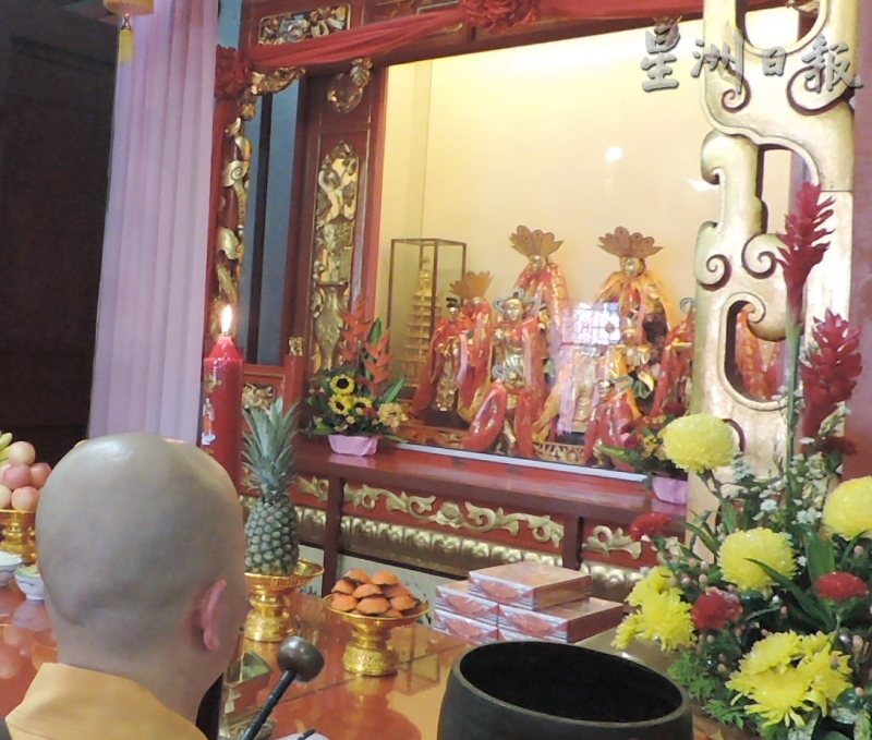 日恒长老(右一)与僧人联合主持观音菩萨诸神护法圣像开光及及安座仪式。(图:星洲日报)
