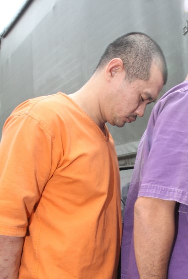 江昌兴身穿囚衣,身形明显消瘦,面无表情,但不愿面对媒体镜头,一直不断闪避及低头。