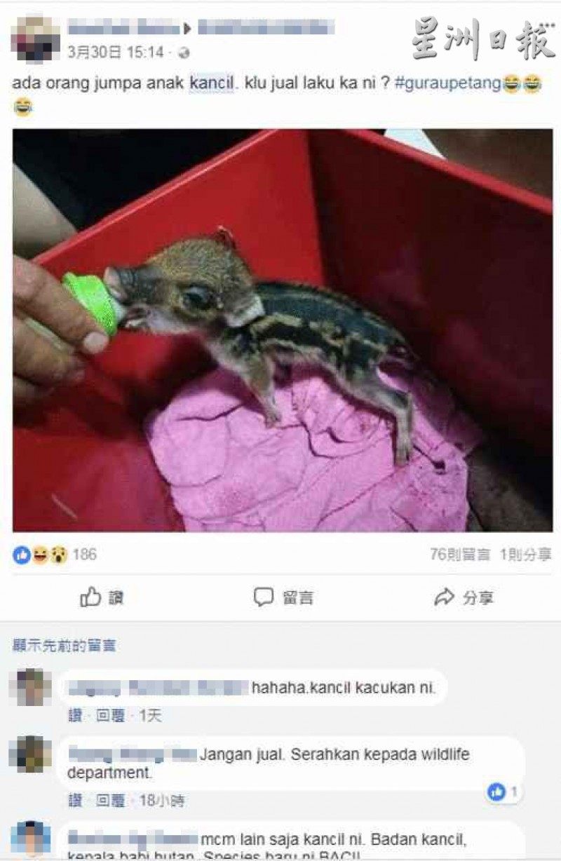 一名网友日前在社交媒体贴出正在喂食一只貌似灵鹿幼崽的照片,并在评论上写道“有人发现灵鹿幼崽,如果售卖会畅销吗?”(Ada orang jumpa anak kancil, kalau jual laku ka ini?)