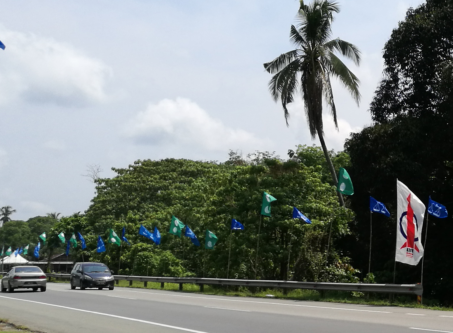 另一个较多党旗的路段是双溪内通往积罗路段,由于峇都达南州议席是公正党选区,所以路上除了国阵的蓝旗之外,公正党的蓝眼旗也不少。