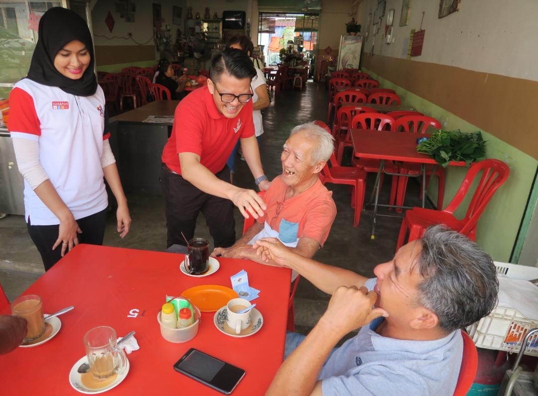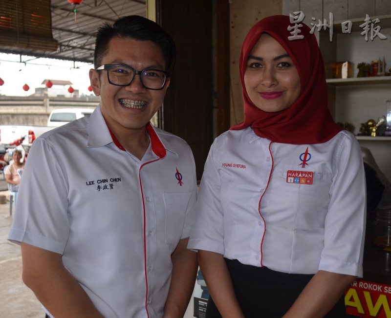 (彭亨.文冬9日讯)原任吉打里区州议员李政贤转战美律选区之际,今早特地到玻璃口巴刹感谢当地选民过去给予他的支持,也趁机向大家介绍样子长得甜美的吉打里选区新候选人菈菈。
