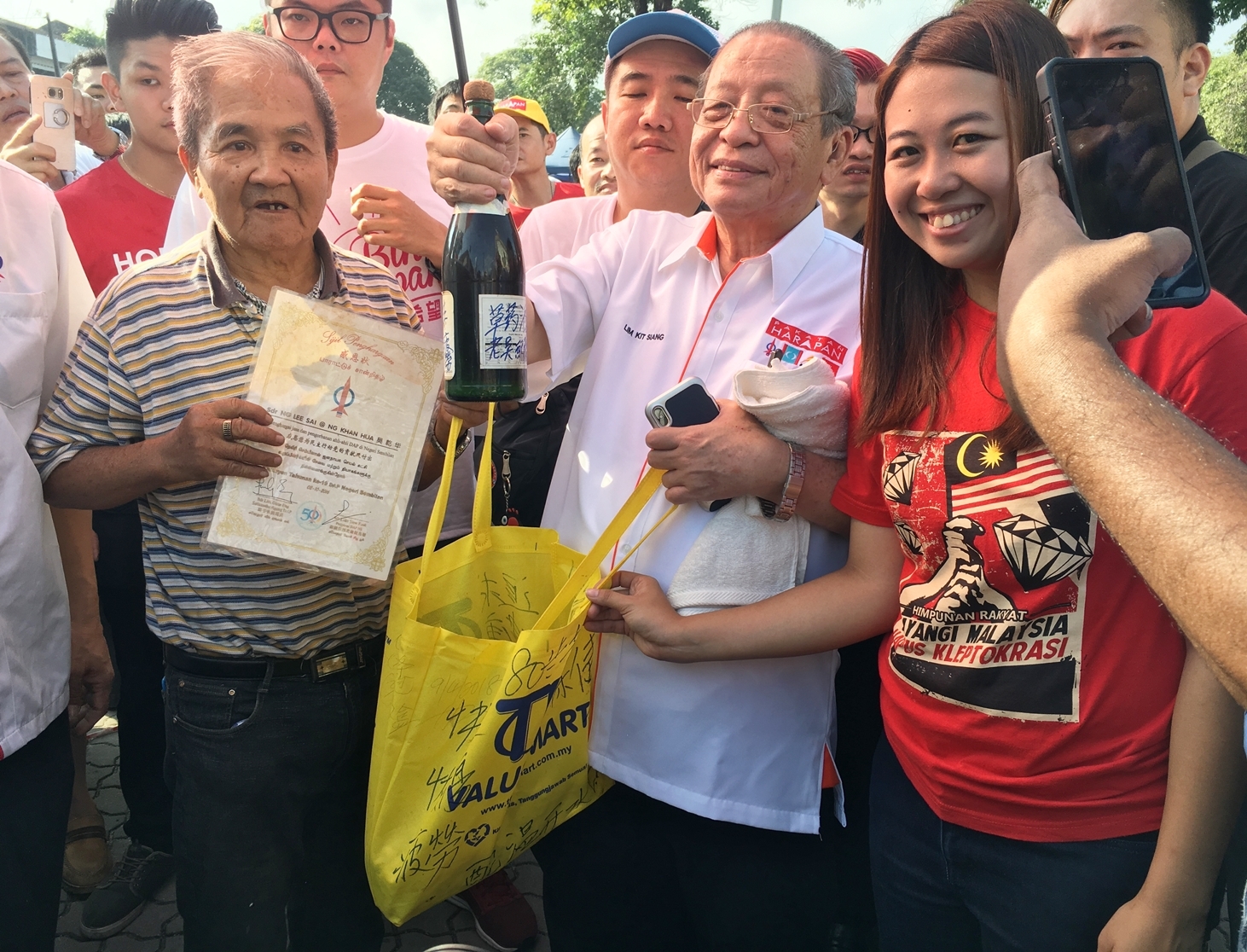 林吉祥(中)星期日一早到新山柔佛再也花园德达14路早市,为希盟行动党柔佛再也州席候选人廖彩彤(右)站台。79岁的支持者吴干华(左)在林吉祥离开前,上前将一瓶自制的草药饮料送给林吉祥,并提醒他最近天气热,要多喝水解暑,保持身体健康。