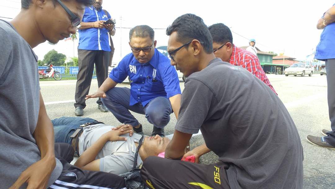 (马六甲26日讯)马六甲首席部长拿督斯里依德利斯哈伦(中)前日傍晚5时许,到选区双溪乌浪夜市展开竞选活动时,突然见到发生车祸,依德利斯马上下车伸出援手,还陪伴伤者直到救伤车抵达。