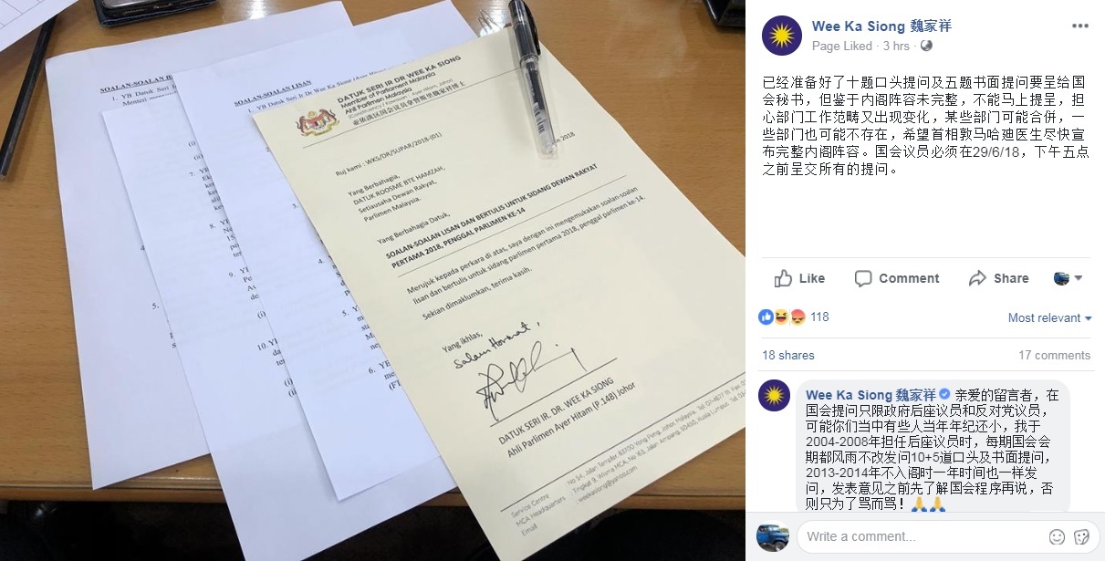 魏家祥也是亚依淡区国会议员,他今日在个人脸书发文透露,自己已经准备好10道口头提问及5道书面提问要呈给国会秘书,但鉴于内阁阵容未完整,他不能马上提呈,担心部门工作范畴又出现变化,某些部门可能合并,一些部门也可能不存在。