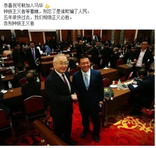日前,某网民在脸书某个拥有超过14万人加入的社交群组上载了倪可敏与魏家祥微笑握手合照的照片,并写道:“恭喜倪可敏加入马华。种族主义者等著瞧,别忘了是谁欺骗了人民。五年很快过去,我们相信正义必胜。告别种族主义者。”