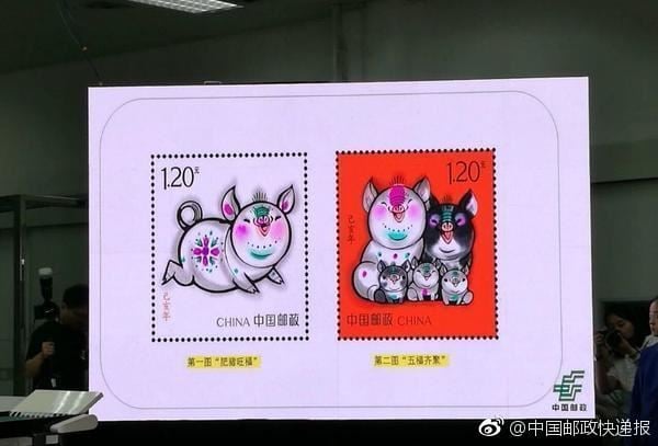 Investing.com网站引用路透社报道,中国邮政在官网上公布预计于明年猪年发行的新邮票设计,上头是2只笑嗨嗨的大猪和3只开心小猪。