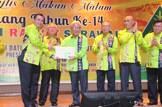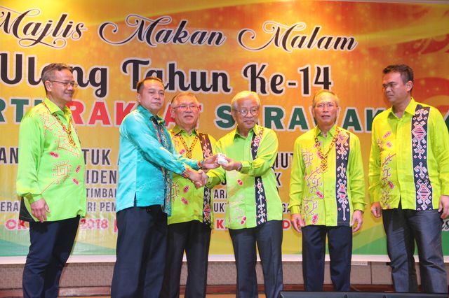 人民党主席詹姆士玛欣(右三)移交党员证给人民党布拉甲美丽特区的党员,由屋长安东尼基蓝代表接领。右起为人民党新任秘书长查南布苏、署理主席佐瑟沙朗,右和右三分别是副主席拿督里旺达岗、人民党14周年纪念庆典晚宴筹备会主席兼副主席约翰西基。