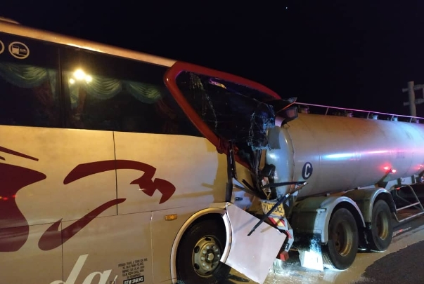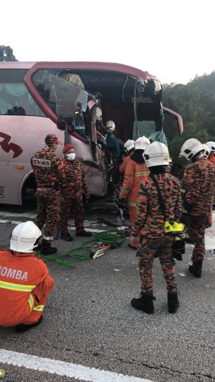 (八打灵再也7日讯)一辆载有30名乘客的长途巴士今晨由南北大道南下前往沙亚南方向途中,突然追撞前方左边车道一辆慢驶的载胶汁的罗里,导致巴士司机当场被夹毙,10名乘客分别受轻重伤。