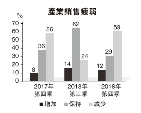 展望接下来一季的销售,只有29%预测,未来几个月销售会比较理想,比2018年第三季的33%、2017年第四季的40%低,大多数(41%)期望销售保持稳定,比之前一季的33%高。