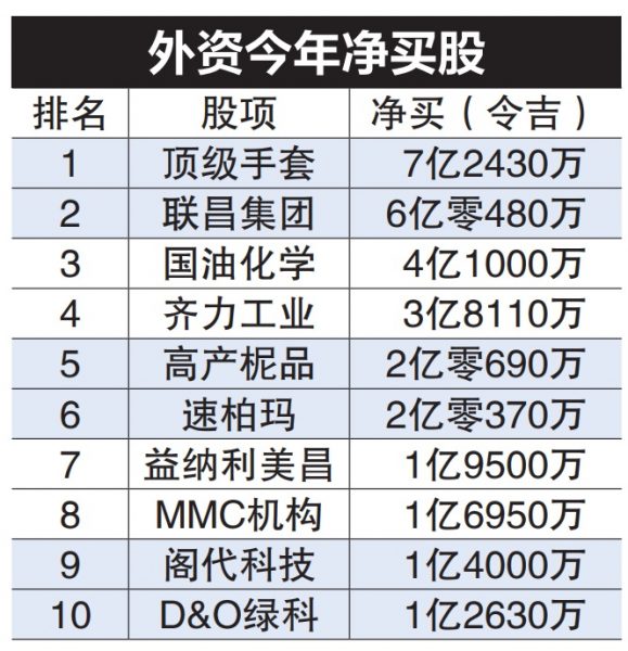 今年至今,外资最支持顶级手套,加码7亿2430万令吉,接下来是联昌集团的6亿零480万令吉,同期外资卖走最多者则是大众银行,净卖高达11亿6520万令吉,远高于第二位贺特佳(HARTA,5168,主板医疗保健组)的6亿1990万令吉。