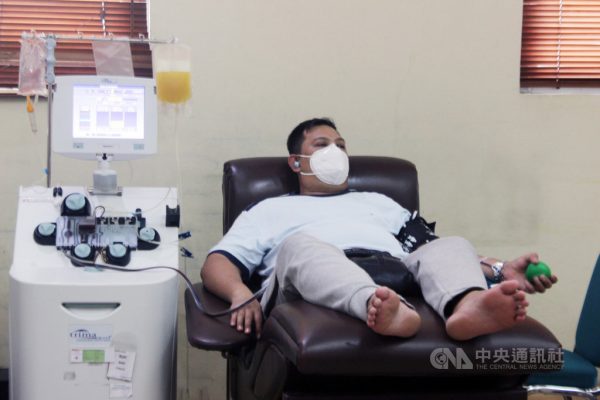 印尼红十字会指出,临床研究显示,冠病痊愈者的血浆是有效的辅助治疗。图为痊愈後的印尼民众里柏尔地在印尼红十字会中心捐血。(图:中央社记者石秀娟雅加达摄)