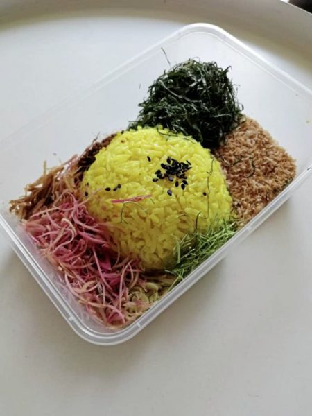 黄色的饭,淡绿深青和粉红米色的细菜丝,没修饰不加工,摆在饭桌上就是天然可食用的调色盘。每次买回一盒,总要看它很多回才舍得下肚。