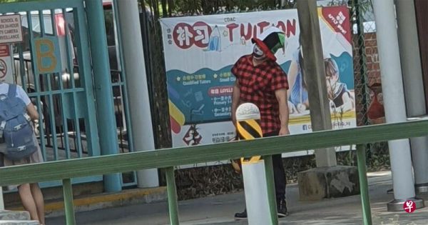 新加坡一名扮成小丑在校外宣传课程的教育中心职员凯林,今日为自己的装扮引致公众误会而道歉。