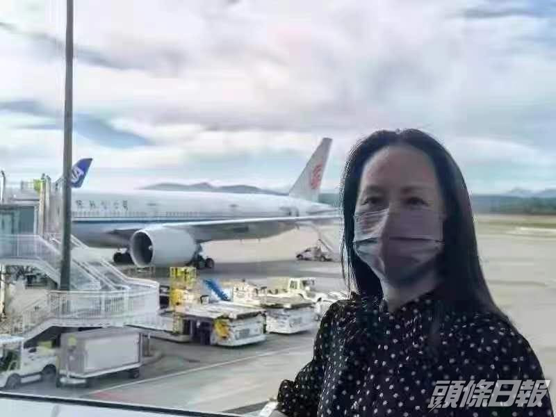 图片可见,孟晚舟在众人陪同下,进入机场禁区并成功登上国航航机,她更在候机区内与国航航机合照,虽戴上口罩,但神情轻松,充分表露能回家的喜悦心情。