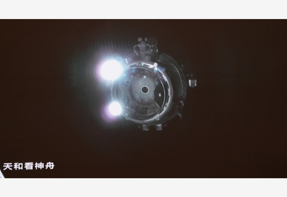 飞船顺利完成入轨状态设置,于清晨6时56分,采用自主快速交会对接模式,成功同天和核心舱对接,同之已经对接的天舟二号、天舟三号货运飞船一同构成四舱组合体,整个交会对接过程历时约6.5小时。