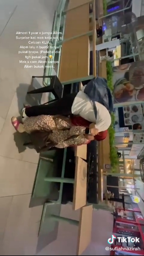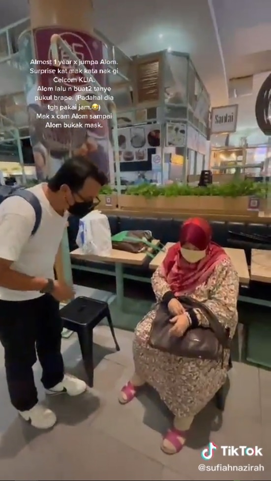 男子假装向母亲问时间,但其母亲却没认出自己的儿子,不疑有他。(截自抖音sufiahnazirah)