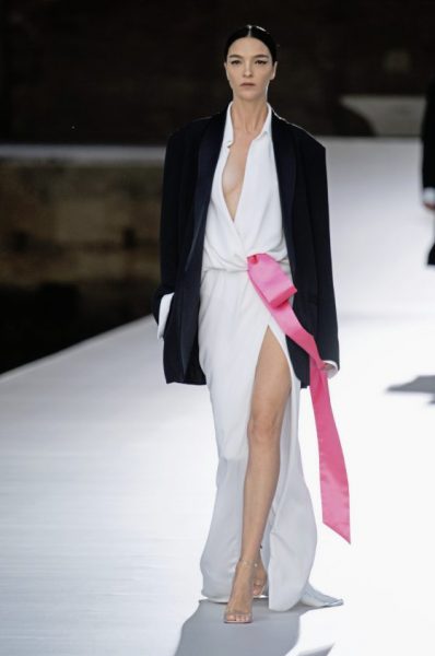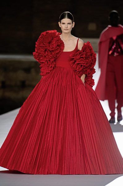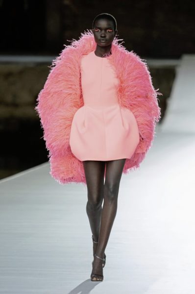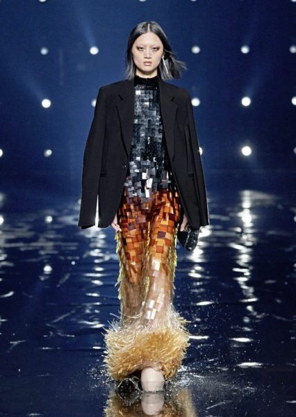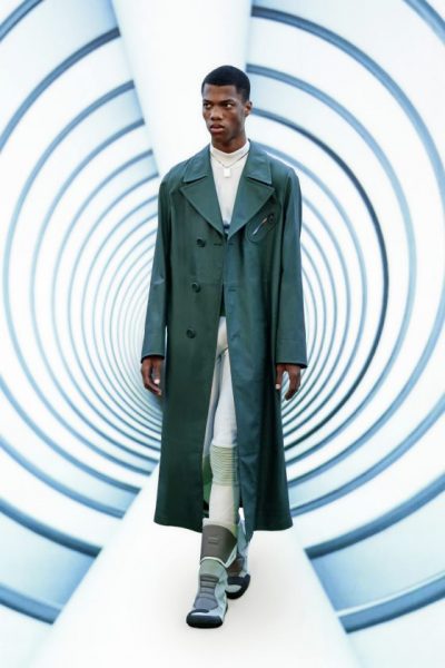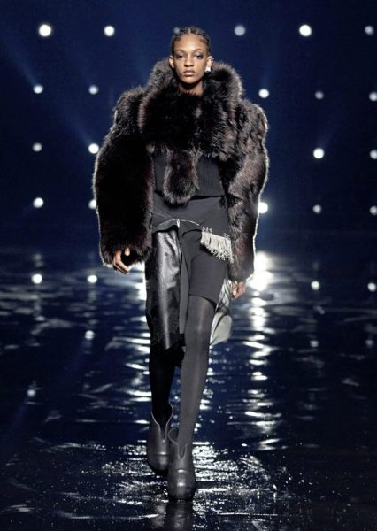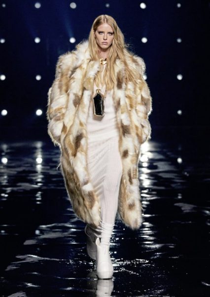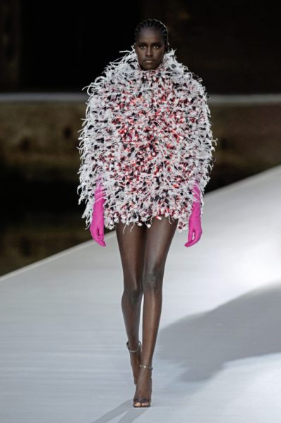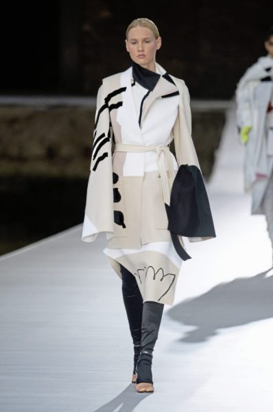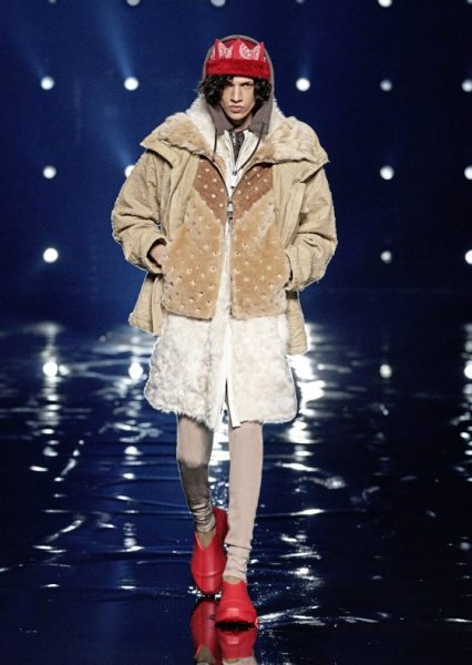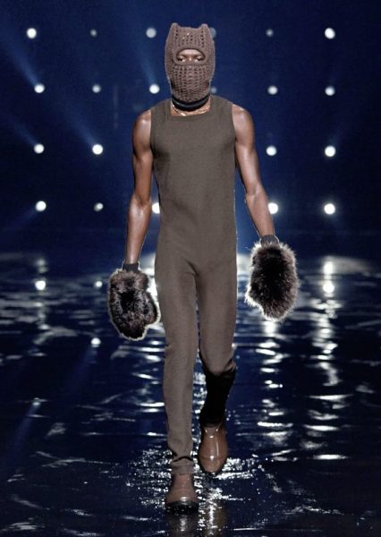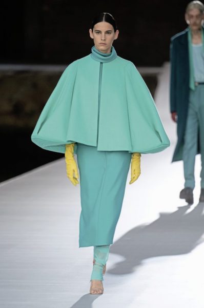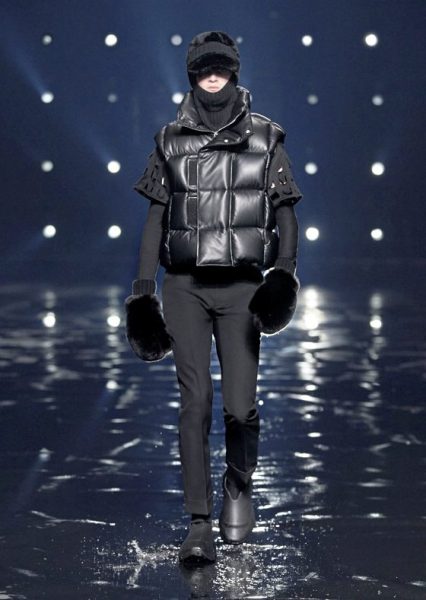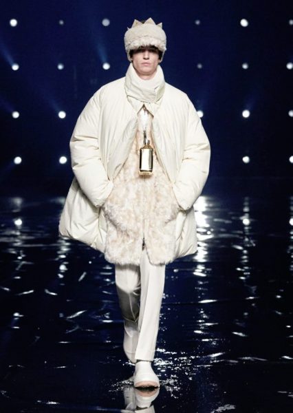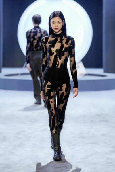 男女装造型将经典、大胆前卫与实用风格结合,探索奢华与纪律之间的张力。选用的物料质感细腻奢华,特别是人造皮草和天然羊毛皮,几乎包裹整个身体。设计刻意强调更夸张夺目的冬季轮廓,以层次塑造不同比例,把舒适与保护、自然和浮夸共冶一炉,同时也探讨大与小之间的张力,修长简洁的线条与短小紧身的剪裁或阔大的褶饰和刺绣形成对比。俐落夺目的肩膊与衣袖设计,为剪裁注入立体美感,而立体精致的针织服则体现灵活自在、解放身体的概念,并突显腰部的线条。外套采用阔身设计,但同时也体现紧密、工整和严谨的风格,在Givenchy工作室的传统西装工艺中更显张力。设计集夸张、玩味、轻巧和舒适于一身,不但成为造型的基础,营造戏剧感,也将风格升华,破拘前卫中不失百搭易衬,刻意营造一个超越乱世的系列,去穿出我行我素独有的态度。
