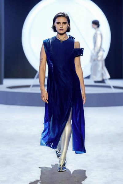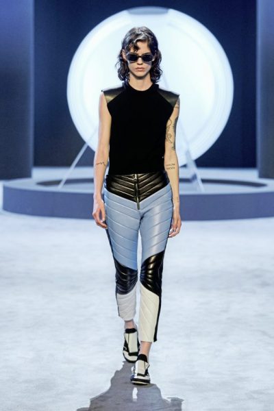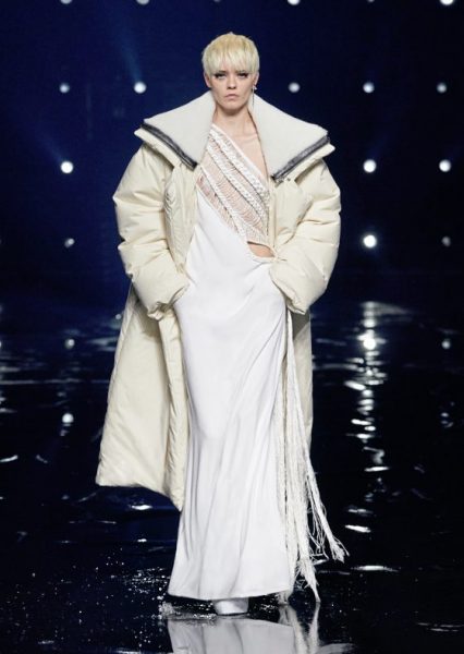 系列设计元素多元化,从军事、运动、竞技、潜水等行业中吸取灵感,大胆融合并精心调整多种剪裁版型,为成衣打造精致的剪裁工艺。男女式衬衫、海马毛针织品、鞋履和配饰,均能相互呼应和搭配,用黑白单色与明艳色彩形成鲜明对比,彰显十足活力。 皮革和羊毛制成的披风、外套和大衣,精制针织衫、针织紧身连衫裤和带有未来抽象派迷彩花纹的连衣裙、保暖实用的皮质大衣,休闲剪裁的长裙和外套,以不规则流苏边饰点缀,舒适而不失俏皮。多款垂褶平纹针织连衣裙和半身裙上配以星形链饰,在秀场上格外闪耀夺目,更延续和保留简洁的剪裁和优雅的线条轮廓的存在主义,不去为logo mania而万岁!