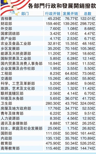 财政部的拨款为298亿7284万5500令吉,行政开销和发展开销分别为159亿4643万4600令吉及139亿2641万零900令吉。