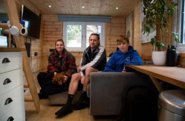 韦斯特伍德(中)厌倦住在伦敦狭小空间、却要负担月租1250英镑的日子,便和女友贝姬(左)、11岁儿子乔斯(右)、狗狗搬进价值5万英镑(约马币28万令吉)的“带轮小房子”,大幅降低生活成本。(影片截图)