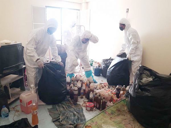 志工汶雅透露,自己接到迪威帮忙收拾租客烂摊子的请求后,便和其他3名志工穿上个人防护设备(PPE),先是在宿舍每一个角落喷洒消毒药水,再把残留在里面的垃圾分批清理掉。