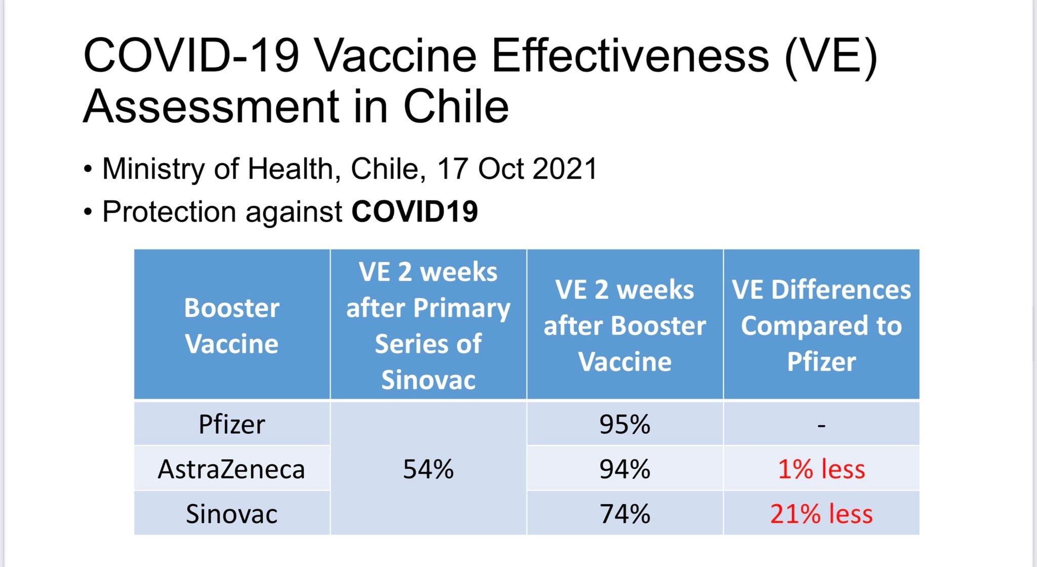 他也分享智利的科兴疫苗接种者,接种各品牌疫苗的加强针有效性数据: