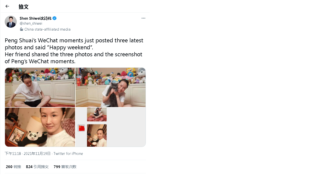 CGTN记者沈诗伟周五晚上11时18分,在推特用英文发文:“彭帅刚刚在微信朋友圈发布3张最新照片,并表示‘周末快乐’。她的朋友分享这3张照片,和彭帅在微信朋友圈的截图。”并附上照片,彭帅开心地逗猫,背后有许多玩偶,以及拿着功夫熊猫玩偶自拍,旁边还有一张与小熊维尼人偶合影的照片。
