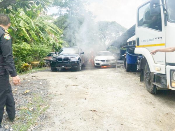 (泰国·曼谷22日讯)曼谷汶滚区纳哇民路111巷一座修车厂21日惊传火警,停放在修车厂内的一辆黑色宾士轿车疑似电线短路自燃后,整辆车子迅速着火燃烧起来,并蔓延至旁边的2辆宝马和另外一辆宾士轿车。曼谷市政府获悉消息后,第一时间派出消防车前往救火,耗时不到20分钟便将火势扑灭,但还是有4辆轿车被大火烧毁,经济损失估计超过1000万铢(约马币126万令吉)。