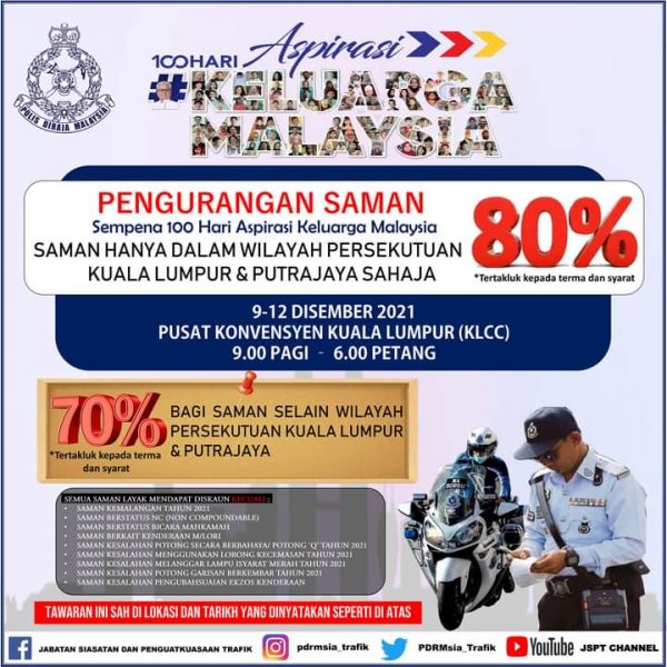 全国警察交通调查及执法部今午在其官方脸书贴文说,在吉隆坡及布城发出的警方交通罚单,可获得高达80%的折扣,其他州属的警方交通罚单则是折扣70%。