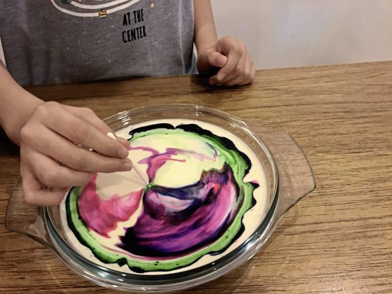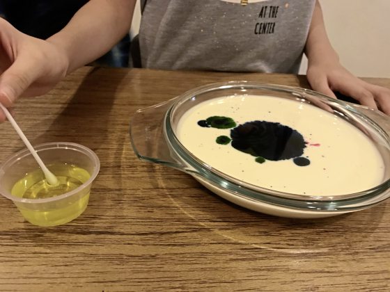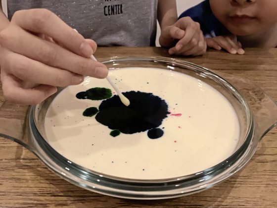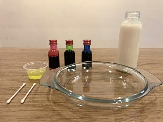 为什么食用色素会自动从棉花棒移开?因为牛奶含有脂肪和水,脂肪是不会溶于水的。而肥皂是由特殊分子组成,可以和脂肪与水产生化学作用,因此当肥皂接触到牛奶中的脂肪分子时,就会溶解并在水中四处移动。肥皂分子寻找脂肪分子结合,当它们在牛奶中移动,就会推动食用色素。这个过程最终会结束,因为所有肥皂分子都会找到连接的脂肪分子,而且它们不再需要四处移动。这就是为什么洗碗剂可以有效去除盘子上的油脂。肥皂分子一旦粘附在油脂分子上,会使它们更容易溶解在水中,所以就能直接冲进下水道。