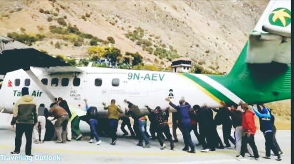 有尼泊尔推特用户分享了当时乘客和机场工作人员约20人推飞机的画面。其推文写道:“大概在我们尼泊尔才有(这种情况)。”