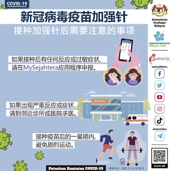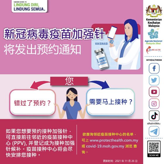 “无论要求任何牌子的加强针,最重要的是检查MySejahtera通知,目前部分爽约的人都是没有检查讯息通知,以致错过了施打日期。”