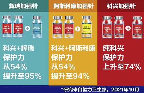 他提出3份报告来支持科兴混打加强针保护力更强的说法,分别是科兴+辉瑞,保护力都可以从54%提升至95%,科兴+阿斯利康从54%提升至94%,而纯科兴保护力则上升至74%。