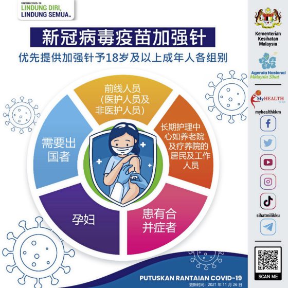 他提到,政府一再呼吁民众施打加强针,是因为研究显示之前接种的两剂疫苗,保护力已降低至54%,加上病毒不断变种,无论任何年龄层都需要施打加强针,除了无法接种疫苗的儿童,“这也就是说,18岁以上的民众都需要施打加强针,只是现阶段我们优先推进年长者及其他病史的人施打,其他年龄层也会紧接着收到通知。”