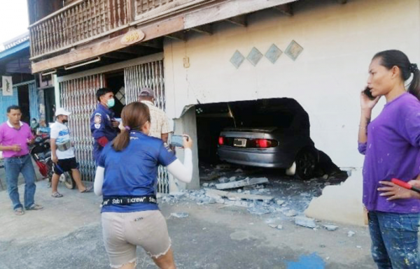 (泰国·曼谷25日讯)泰国那空沙旺府派沙利县昨天发生一起轿车衝破民宅围墙事故,当地派沙利佛寺一名僧人驾车到医院看病途中,因为有狗狗突然从路边冲出,僧人一时受惊过度错把油门当成刹车,结果连人带车衝撞进一座民宅内。