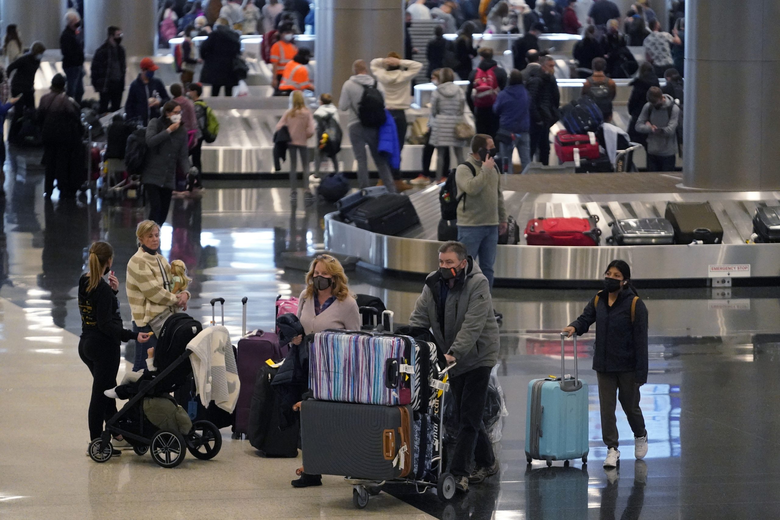 旅客们周一在盐湖城国际机场遭遇因机组人员染疫缺人手下,被迫取消行程的窘境。(美联社照片)