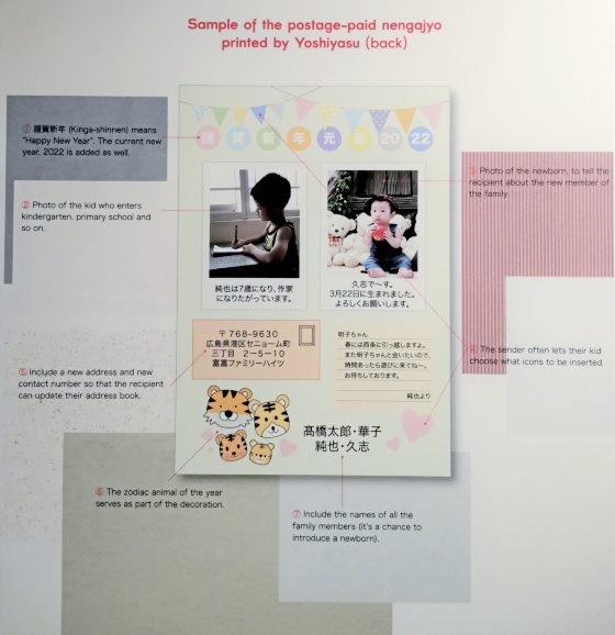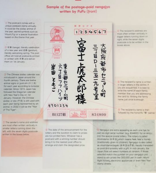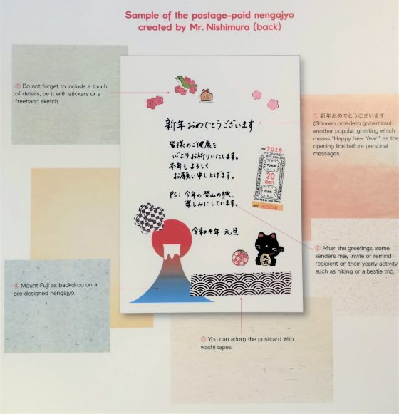 林振富指出,日本贺年卡的尺寸跟明信片差距不大,分为封面和背面,由邮政局发出的贺年卡一般印有红色的邮票和“年贺”字样。此外民众同样可以用一般明信片作为贺年卡,需要留意的是必须在邮票的下方以红字标示“年贺”,这样邮局就会帮忙自动分类为贺年卡,并在元旦当年天寄出,否则很有可能在新年前就送到了。