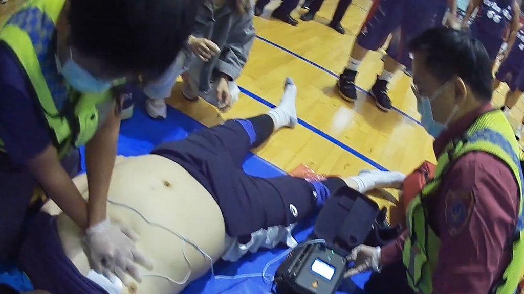 (台湾·花莲县9日讯)台湾花莲县消防局日前接获民众报案,1名40多岁壮年男子在篮球场打球时突然倒地不起,现场人员第一时间进行心肺复苏术(CPR)直到消防人员抵达後接手,成功保住一命。