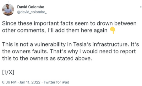 科伦坡并未透露软件漏洞的详细细节,仅说漏洞不在特斯拉的软件或基础设施内。另外,科伦坡还表示,全球只有一小部分特斯拉车主受到影响。