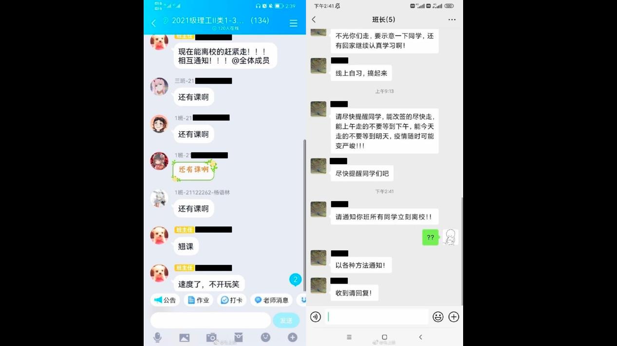 据台湾东森新闻报道,昨晚开始就有不少上海大学的大学生在微博留言,表示老师在群组中通知“请尽快离开学校,现在能离校的赶紧走!”、能上午走的不要等到下午、能今天走的不要等到明天!疫情随时可能变严峻!”
