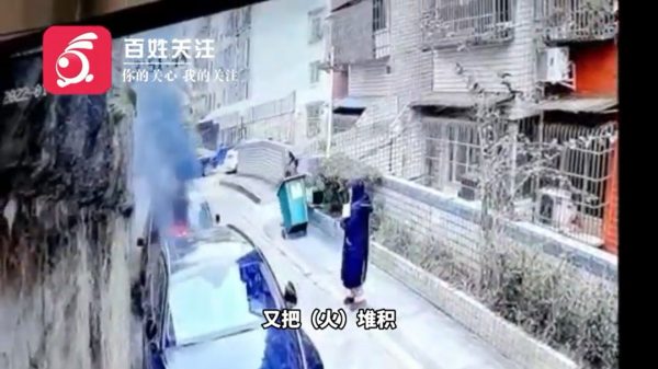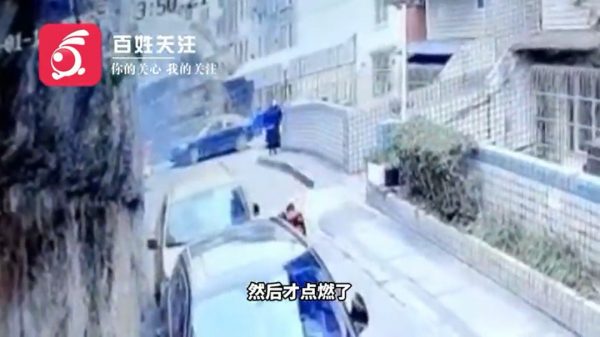 根据街道监控画面显示,小孩先是在车旁拔草来烧,最初火没有燃起来,两人又把草拿到两辆车中间烧,想借前车来挡风。