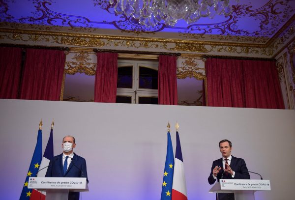 法国总理卡斯泰(左)和卫生部长韦朗(右)在记者会上宣布最新的疫苗通行证将于24日上路。此外,政府也将分阶段松绑户外强制戴口罩的限制措施。