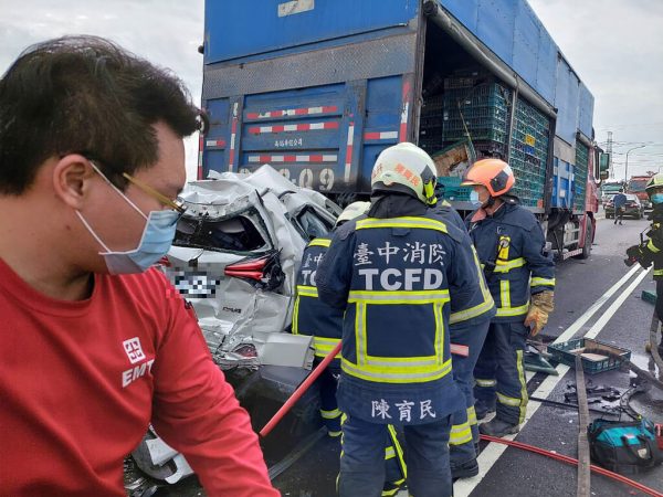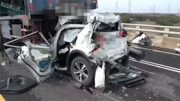 (台湾23日讯)台17线中彰大桥今天发生5车碰撞事故,酿6人受伤,其中1辆休旅车夹在2辆大车间彷彿“夹心饼”,路过民众见状都觉得乘客凶多吉少,所幸休旅车内2人获救脱困时意识清楚。