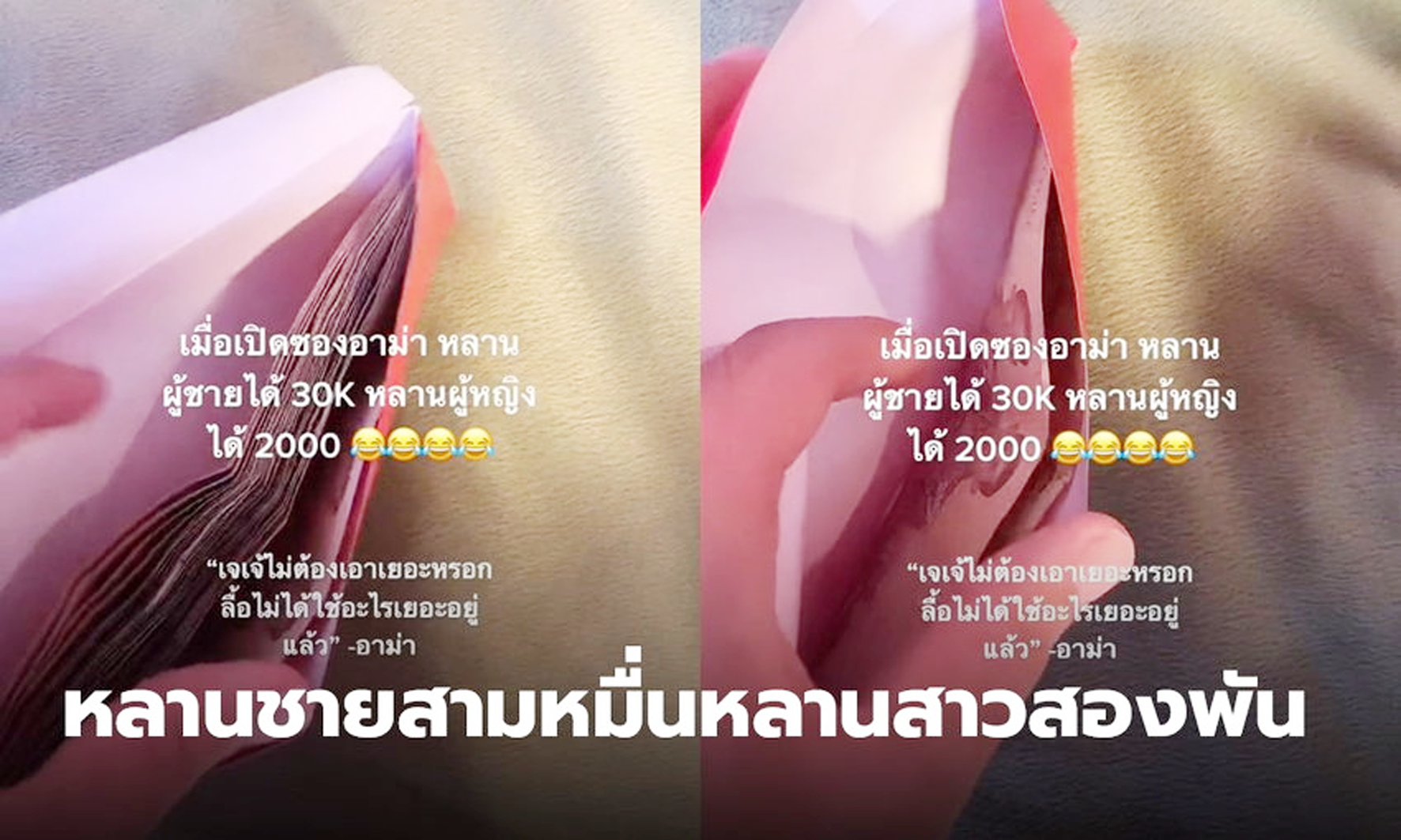 至於红包的问题,长辈们准备的红包是有分次序的,首先长男孙得到最多,其次是次男孙,等到男孙全部拿到红包後,然後才到长女孙和次女孙,如此类推,之所以他得到3万铢,而姊姊只得到2000铢,主要是两人之间还相隔了其他男孙,因此才会引起网友的误会。